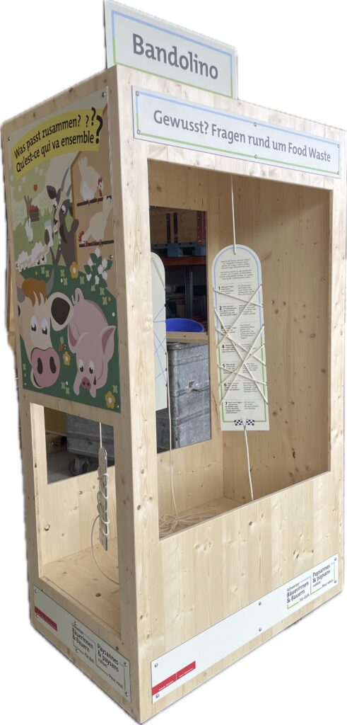 | Description/contenu : | Module en forme de colonne sur le thème du gaspillage alimentaire avec deux planches de jeu Bandolino pour adultes et une planche de jeu Bandolino pour les tout-petits. Un panneau informatif avec des conseils pratiques pour éviter le gaspillage alimentaire au quotidien complète le module de manière optimale. |